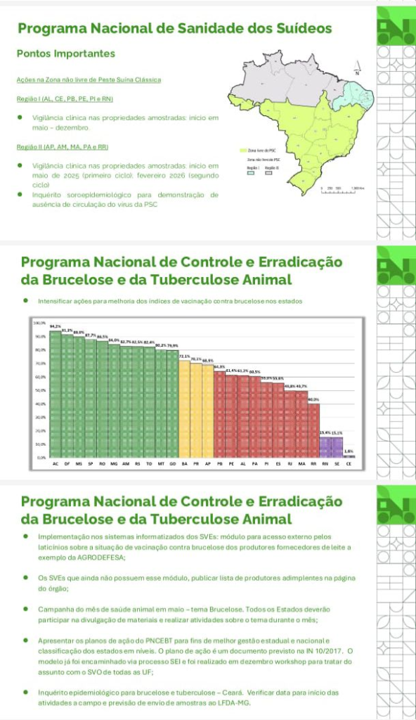 O encontro reuniu representantes dos órgãos estaduais de defesa agropecuária de todo o país para discutir avanços, desafios e diretrizes relacionadas à sanidade animal e vegetal no Brasil. Entre os principais temas debatidos estiveram pautas conjuntas com o Ministério da Agricultura e Pecuária (Mapa), como o credenciamento de empresas para a realização de inspeção em agroindústrias e o fortalecimento de programas nacionais de controle sanitário.