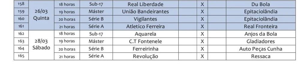 Antes disso, às 19h, pela categoria Master, jogam União Bandeirantes e Epitaciolândia.