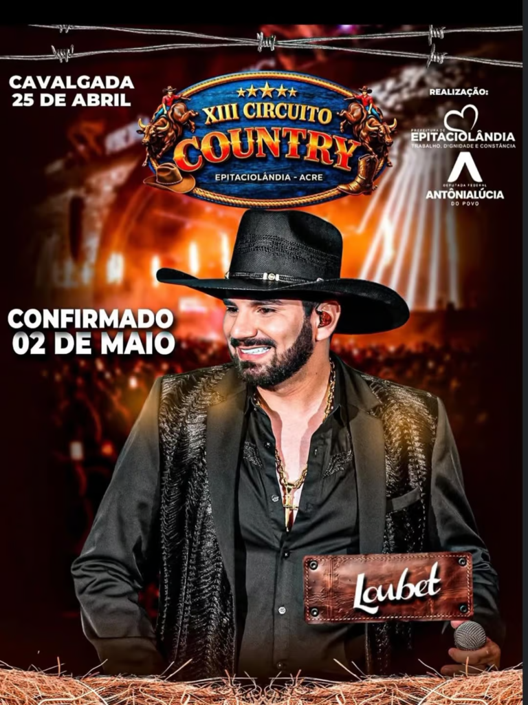 O município de Epitaciolândia, no interior do Acre, recebe no sábado (2) de maio o cantor Loubet para uma apresentação no XIII Circuito Country. O evento conta com a realização da Prefeitura de Epitaciolândia e o apoio da deputada federal Antônia Lúcia.