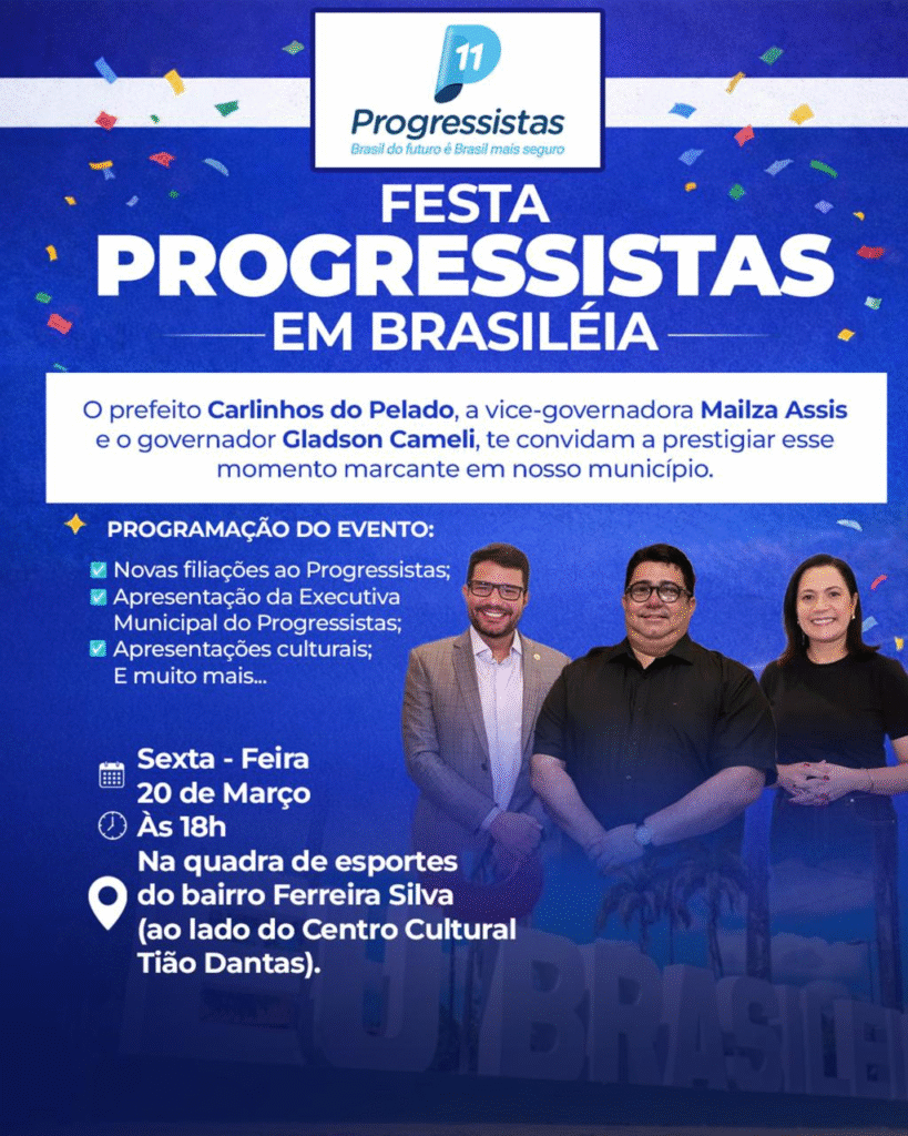 A programação, chamada de “Festa Progressistas em Brasiléia”, deve reunir lideranças políticas, filiados e apoiadores do partido na região. O evento contará com a participação da vice-governadora do estado, Mailza Assis, e do governador do Acre, Gladson Cameli.