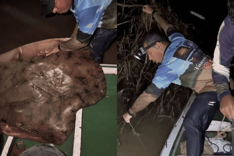 Uma arraia com peso estimado em mais de 80 quilos foi capturada no Rio Acre, em Assis Brasil, pelo pescador profissional e criador de conteúdo