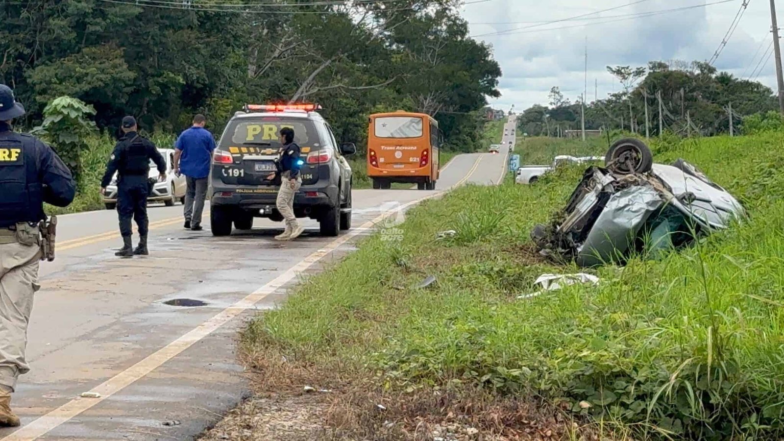Colisão entre dois táxis termina com veículo capotado na BR-364, em Bujari