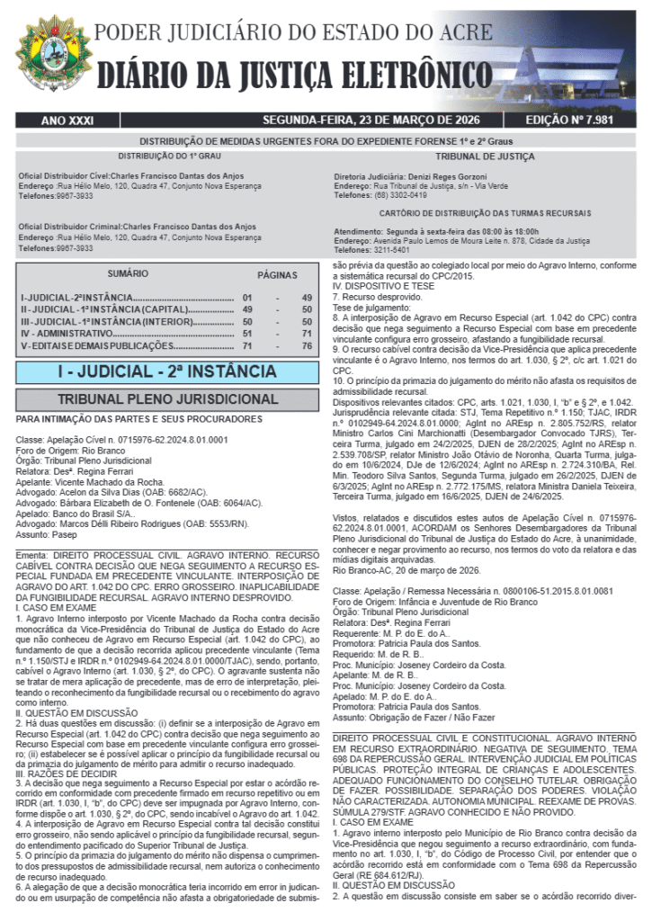O Tribunal de Justiça do Acre divulgou nesta segunda-feira, 23, a quinquagésima sétima convocação de estudantes aprovados no processo seletivo para estágio em unidades judiciárias e administrativas de Rio Branco. A medida visa reforçar a equipe com estagiários que auxiliarão nos serviços essenciais e garantirão o andamento das demandas do Poder Judiciário.