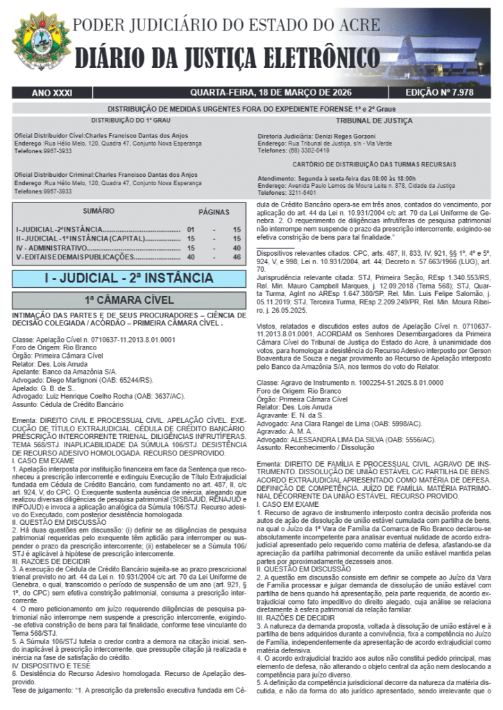 O Tribunal de Justiça do Acre publicou nesta quarta-feira, 18, novos editais convocando candidatos aprovados em processos seletivos de estágio para entrega de documentação e formação de cadastro reserva. As convocações contemplam estudantes de pós-graduação em Direito e também de graduação em diversas áreas, com atuação prevista em comarcas de todo o estado.